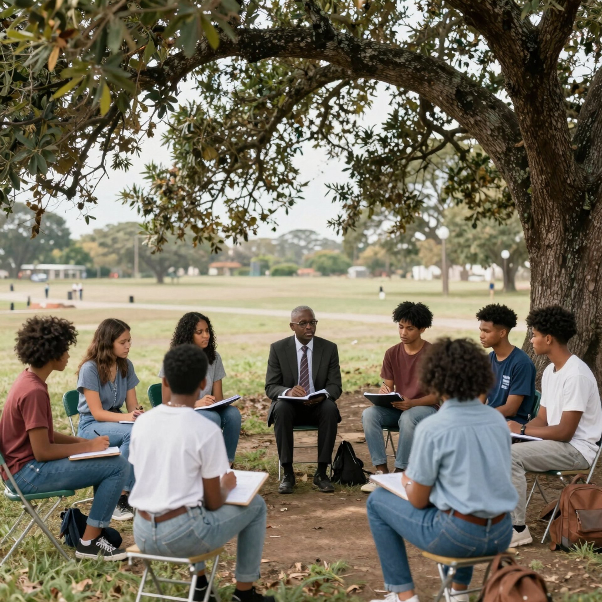 A group of Kenyan community members engaged in a lively discussion outdoors, symbolizing unity and resilience.
